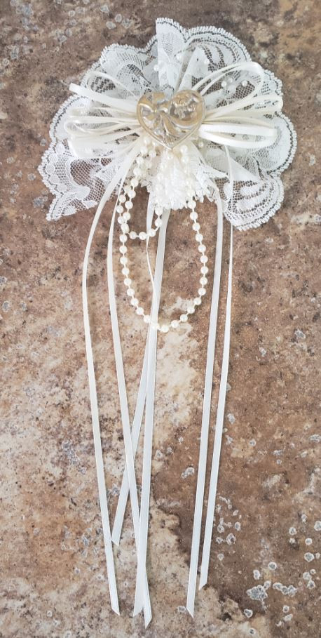 Tie-on in Ivroy. beautiful elegant Ivory Fan-shape tie-on. Ivory lace, Ribbon Beads and a gold heart charm. Add to Cake knives, toasting glasses, cake tops, Candles, or anything you want to decorate for a wedding, anniversary or other events. attach to a comb for a hair piece decoration. Approx. 4.75" across. Approx. 11" L.
