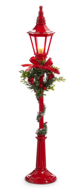 RED plastic LED Lamp Post. Approx. 18"H. Base is approx. 3 3/8"D. Decorated with Christmas Wreath and red holly berries. Uses 2 3-Volt button CR2032 Batteries included.