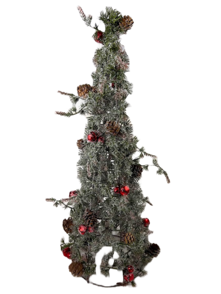 Beautiful Wire Cone Tred covered with Artificial Pine, Red Jingle Bells, and miniture Pine Cones. Sprinkled with artificial snow. Approx. 20" high.