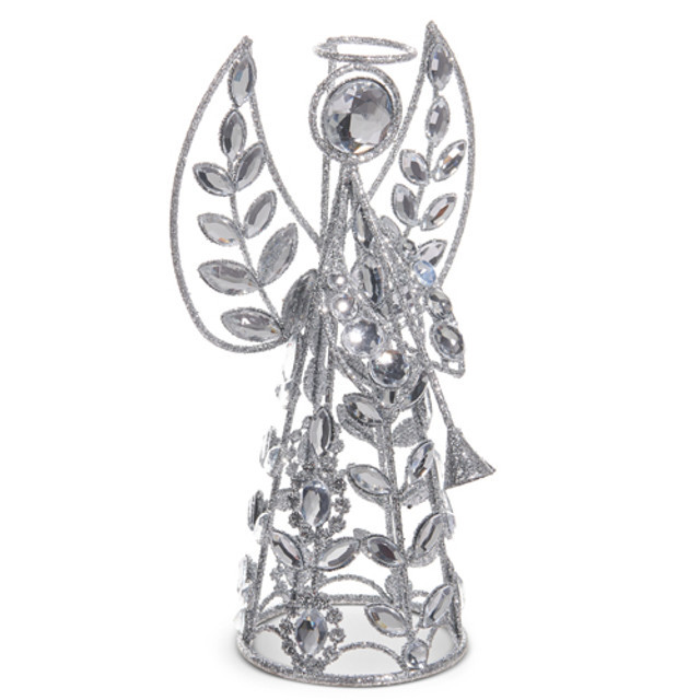 Silver Metal angel with clear Jewels Tree Topper or a standing ornament. Approx. 7.5"H x 4"W x 3"D base.