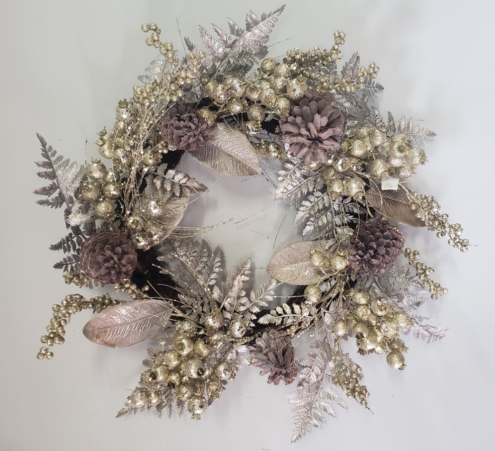 - WREATH SVILVER FERNS MAGNOLIA LEAVES GOLD ROSEHIPS & PINE CONES 24"
