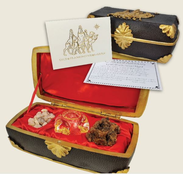 Gold, Frankincense, and Myrrh. When opened, classical guitar rendition of "We Three Kings" and "Joy to the World" bring added joy to the appreciation of the original gifts. Music box has on-off switch and plays using AG10 batteries included.