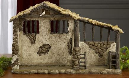 The lighted stable is designed to capture the reality of the humble stable where Jesus was born. The stable depicts stone and stucco walls, weathered log beams and posts and a humble, palm thatched roof. The hay strewn floor and trough imagines the very stable behind the inn on that first Christmas. Included in the stable is a light that shines down on the manger below. Accomocates Standard and 7 inch Nativity figurines.