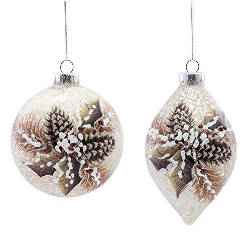 Assortment of Glass Ball and Oval Drop Ornaments. White Snow, Holly and Pinecone hand-painted design. Approx. 3.5" Diameter. Silver Cord Hanger. After placing online order please e-mail Style preference to sekanocc@sekan.com.
