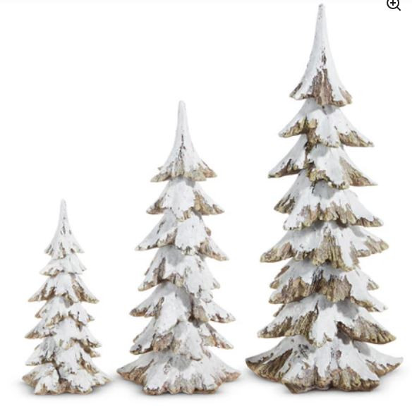 Set of Resin snow tree figurines. These Snowy Trees have a natural, rustic look that makes the perfect addition to holiday decor. They have a distressed, snow-covered design for a wintery look that looks great on a mantel or table. Measures: 6.5"L x 6.5"W x 16.25"H; 5.5"L x 5"W x 12.25"H; 3.75"L x 3.75"W x 8.25"H