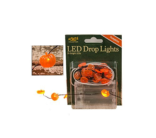 20 Orange pumpkin LED design lights on a 6.56' cord. Uses 3 "AAA" batteries not includes. 30 hr. of bright light. LED lights are submersible with reduced operating hours. (Do Not Submerse Battery Pack). On/Off switch and automatic timer. Great to use on cakes, floral arrangement or craft projects.