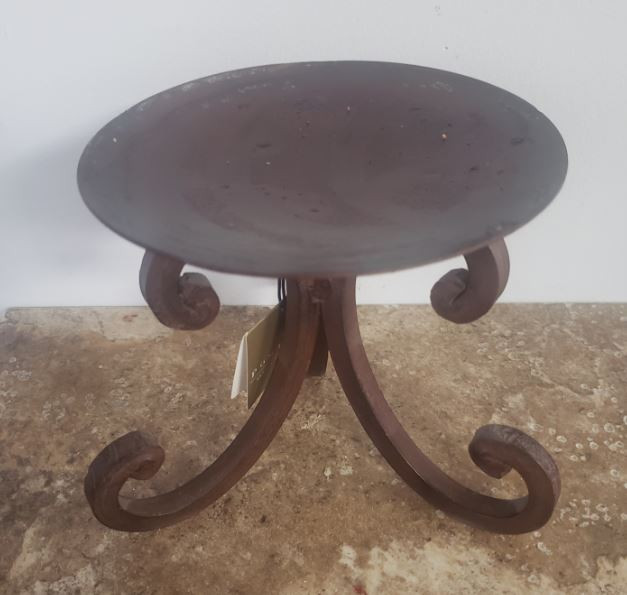 Brown metal Pillar Candle Holder. The Plate is approx. 6.5" D the holder is approx. 6.25"H. Functional Heavy Duty iron will hold 6"x 12" Pillars. Made in India.