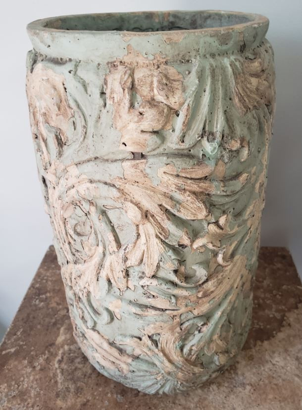 Cement Pot Mint Green and Beige swirl pattern. The Pot is approx. 14"H x 8"diameter. the opening is approx. 6"