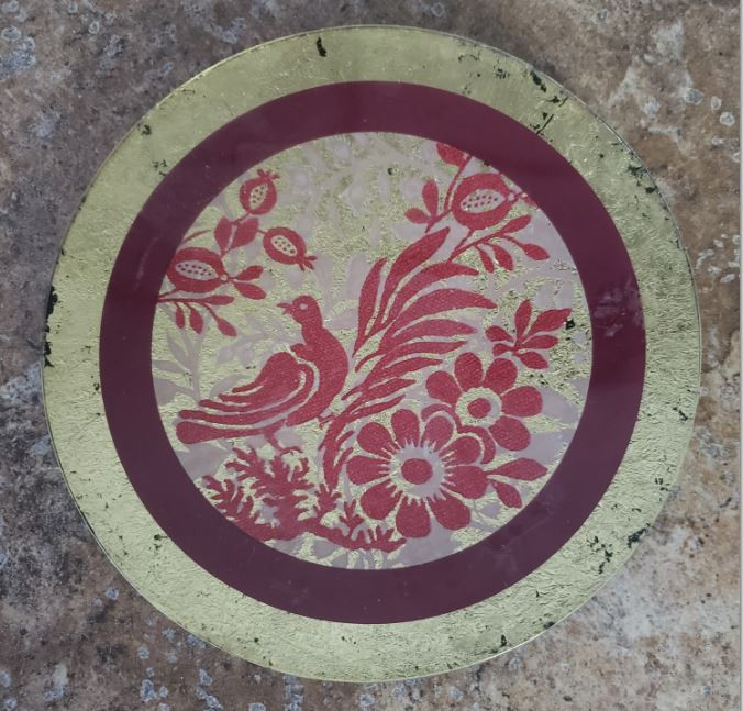 Decorative glass plate with gold foil and burgundy red flowers and bird design. Not food safe-for decorative purposes. Makes a great base for up to a 6" pillar candle. Use a wire plate hanger and hang on a wall.