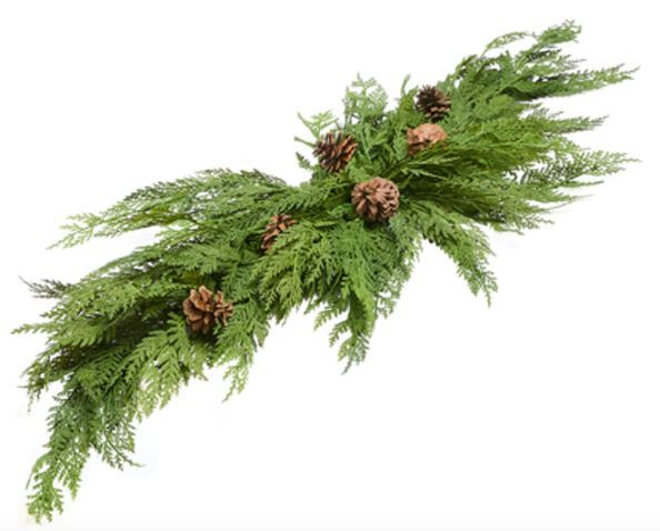 Effortlessly style your Christmas décor with this 52" Cedar and Pine Swag Decoration. Designed with realistic cedar greenery and dotted with tiny pinecones, it brings a natural woodland touch to your home. Use it as a mantle swag, drape it over a doorway, or place it on a dining table as a centerpiece. Beautiful on its own or enhanced with fairy lights, ribbons, or ornaments, it’s a versatile piece that creates instant Christmas charm. Made by Raz Imports. Made of PVC.
