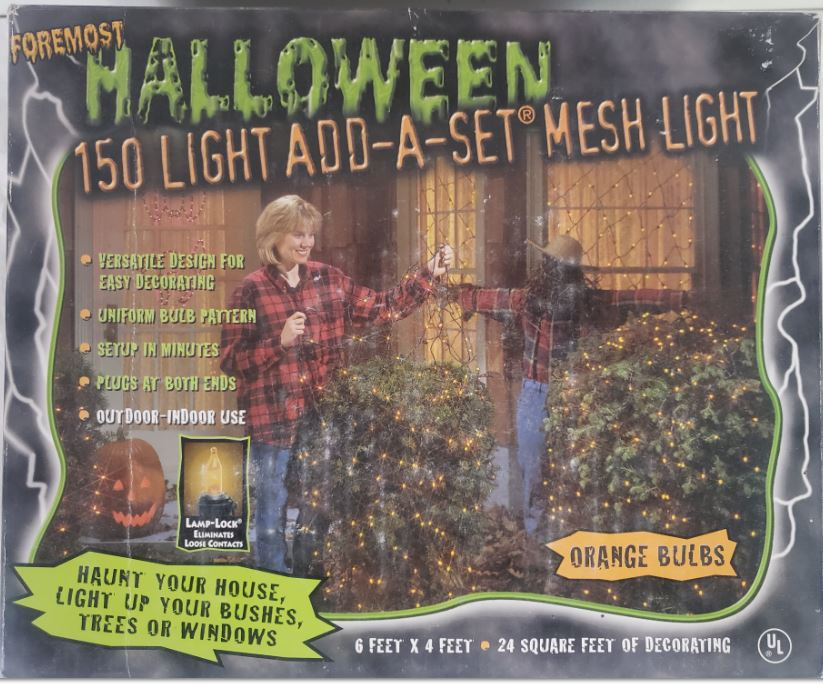 Net lights: 150 add end to end mesh light set. Orange bulbs. Meets or Exceeds the 17th Edition of ULS. Heavy black wire and heavy Duty Plug. For indoor or outdoor use. Flashing or non-flashing. Bulbs remain lit even if one burns out.Spare bulbs and fuses included. Measures 6 ft. x 4 ft. Decorate bushes windows and trees.