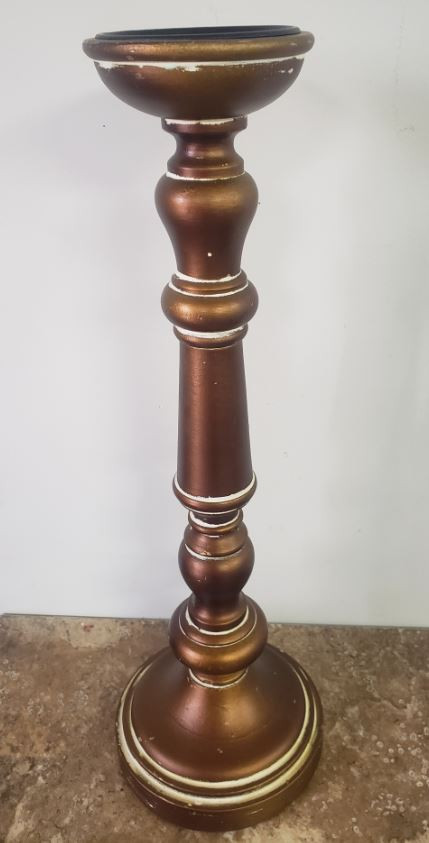 Wood Pillar Candleholder Bronze and white. Note the painting is intentionally distress look. Approx. 18"H. Holds up to a 3" pillar candle. The base is approx. 5.75"