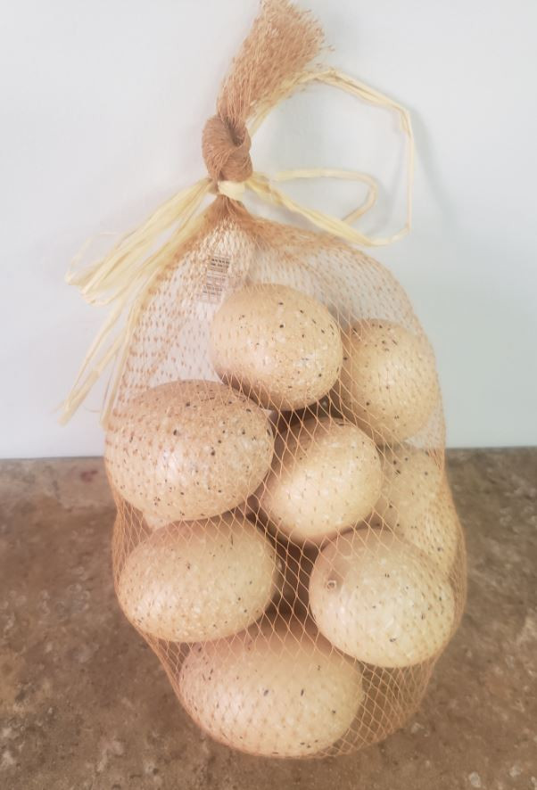 Plastic Mesh bag of brown fake speckled eggs. Natural color-natural size.