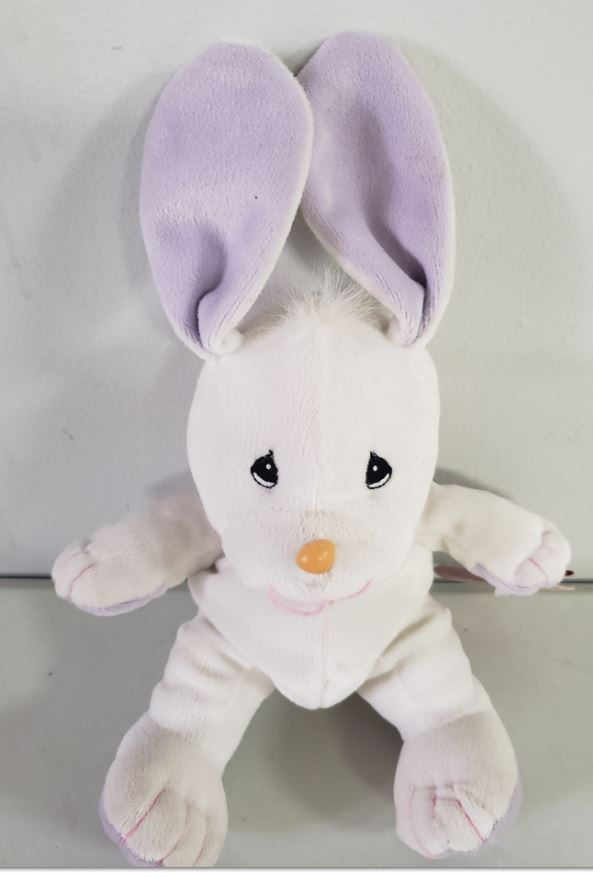 Precious Moments Tender Tails bunny rabbit, white and Lavendar. Approx 8.5"H. New with Tags attached. made with polyester fibre and filled with plastic pellets.