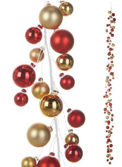 Shimmering and Matte finish Red and Gold Christmas Balls in a 6 Ft. long garland. Great for decorating trees and wreaths or use for other holiday decor.