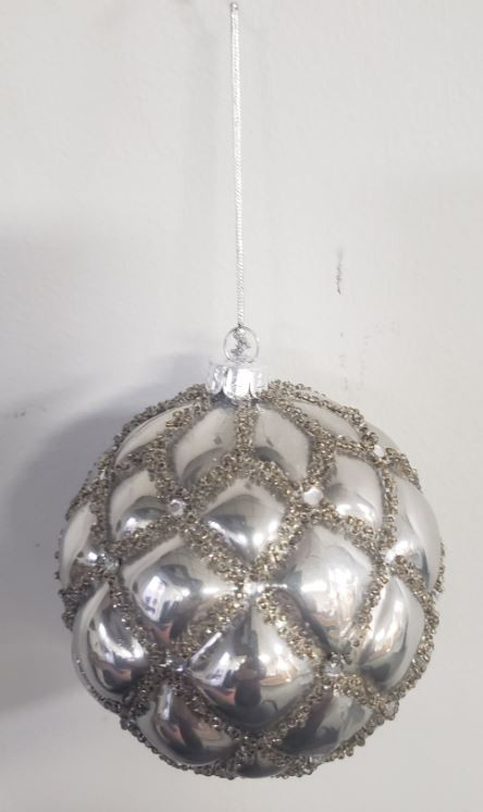 ORN SILVER GLITTERED QUILT DESIGN BALL 4"