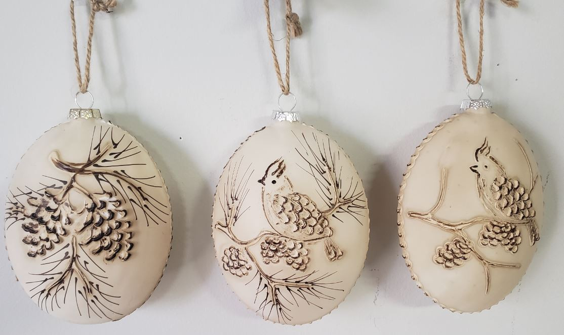 - ORNAMENT GLASS BIRD / PINE CONE IVORY 5"