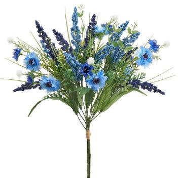 Poly-silk bush of Cornflowers, thistle, berries in blue colors. The bush Approx. 22"H and tied with jute. Add ribbon and bow and you have a perfect wedding nosegay.