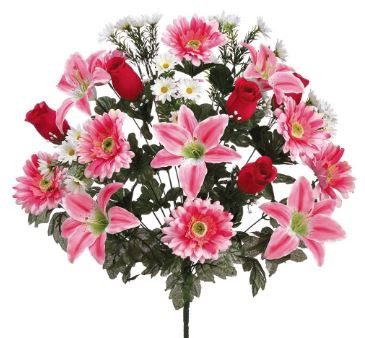Beautiful poly-silk bush with mix of Lilys, Gerbera daisies, and Roses in pinks and burgundy colors. 24 stems with flowers and leaves. Approx. 22"H