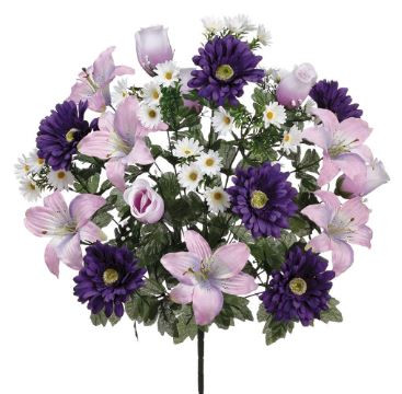 Beautiful poly-silk bush with mix of Lilys, Gerbera daisies, and Roses in Purple shades and white. 24 stems with flowers and leaves. Approx. 22"H