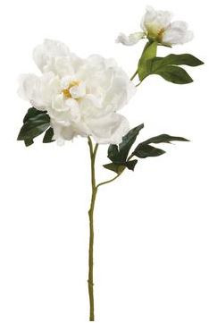 Silk White Peony stem with 1- 5 inch diameter head and a 2.25 inch Bud. Total stem ia approx. 19.5 in. Green natural-looking Leaves.