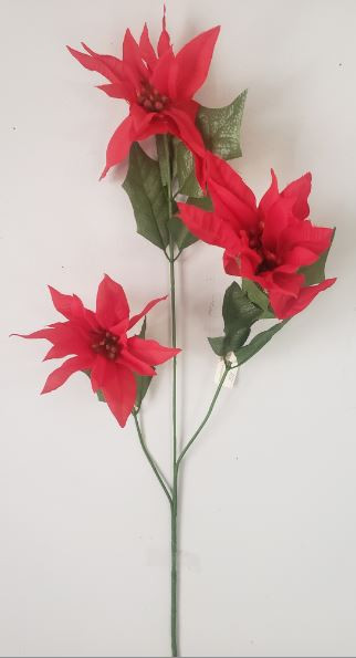 Silk poinsettia stem. Each stem has 3 flowers the largest is approx. 5.5" diameter. The Total stem is approx. 20" H. Great to put on gravesites.
