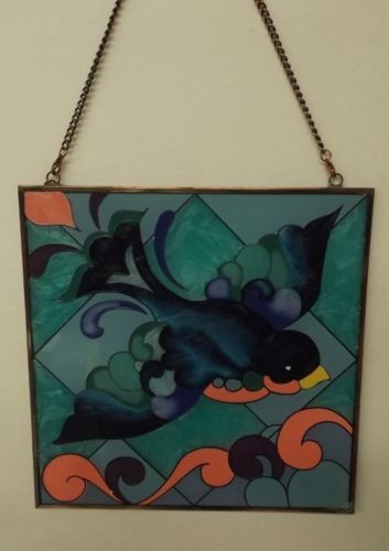A beautiful Hand-painted Stained glasses Suncatcher. Bluebird design. Approx. 6.25" square with metal chain hanger. Jim Shore Heartwook Creek design.