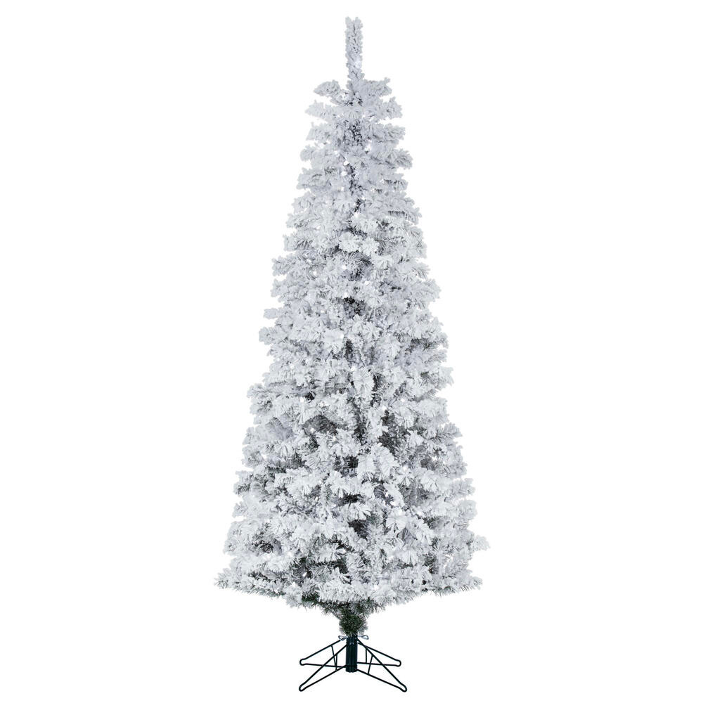 Artificial 7.5' x 36" Prelit Flocked Pacific Pencil Christmas tree featuring 438 PVC tips and 400 Warm White LED Italian mini lights. This tree has beautifully flocked tips on metal hinged branches, energy efficient LED lights, a convenient on/off step switch, and a Metal tree stand is included.