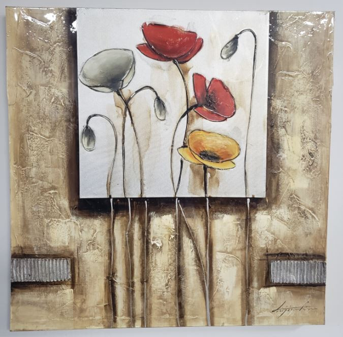 Hand painted Original Painting. Acrylic Red/orange and Yellow Poppies on a natural background with glaze covering. Painted on a double canvass- one smaller placed on the larger. Approx. 27.5" x 27.5" x 2" Deep. Certificate of Authenticity enclosed.